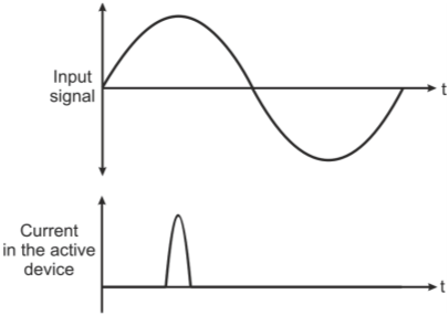 Class C amplifiers conduct for less than 50% of the input signal. The active device in case of class C amplifiers is so biased that it conducts for less than one half of the input cycle, that is, it operates for less than 180o of the input cycle (refer to figure below).